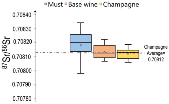 The effect of blending on the Sr isotopic ratio from must to Champagnes is presented in Figure 5. The effect of the different blending steps can be clearly seen in Figure 5 with the statistical analysis and the standard deviation that decreases through the elaboration process (from 0.00022 for must to 0.00007 for Champagne).