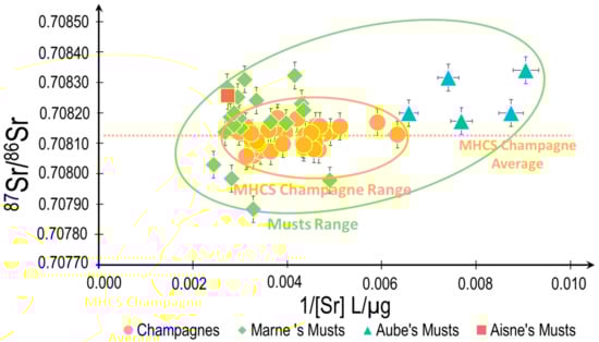 The blending process used in Champagne mixes musts from different bedrocks. Hence, the biochemical Sr signature can be compared for musts from various origins and Champagne by plotting the Sr isotopic ratio as a function of the concentration of Sr (1/[Sr]) as presented in Figure 6. Despite the large variation of Sr in the soils (10 to 1000 mg/kg) [23], the overall isotopic Sr signatures in the musts do only vary in a very small range between 0.70780 and 0.70830.
