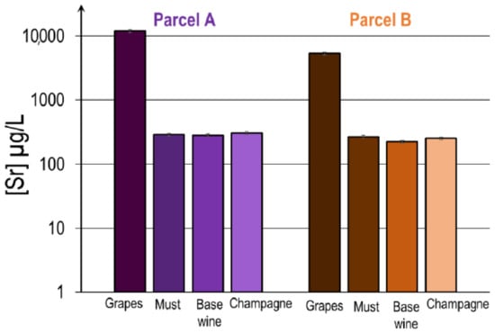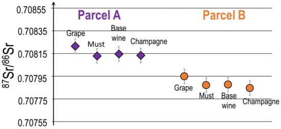 A slight trend of decrease in Sr isotopic composition can also be observed in both blocs between the grapes and the musts presented but then Sr signatures remain constant throughout the rest of the process (Figure 8). These slight differences should be linked to the removal of skins and pips during pressing, which could slightly influence the Sr isotopic ratio. Even after a loss in concentration of Sr between grapes and musts of a factor of 40 for parcel A (Chardonnay) and a factor of 20 for parcel B (Pinot noir), the Sr isotope ratios remain quite unchanged. The elaboration process does not significantly change the Sr isotopic composition of grapes/musts/base wines/Champagnes. These results are consistent with previously published data on other types of wines [12,13,16,17,19,20,27,28,29]. The Sr isotopic ratio of the Champagne is in general very similar to the Sr isotopic ratio of the labile fraction of the soil where the vine was grown [3,8,13,16,17,19,25,26].