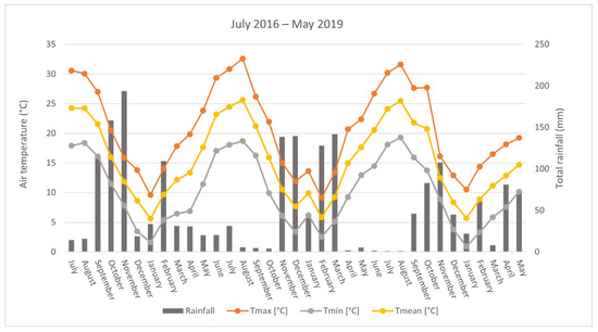 Monthly precipitations and mean minimum, maximum and mean air temperatures (°C) during the study period.