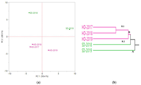 PC2 axis was the one responsible for the differentiation between the two techniques used for distillation; in fact, samples distilled by SD were in positive loading according to this axis, while those obtained by HD were of negative loading (Figure 2a). Even though no significant difference was proven by the one-way PERMANOVA performed on SD samples, this plot positioned them in two different quadrants: SD-2019 was in the positive loading in both axes PC1 and PC2, while SD-2018 was in the opposite quadrant (negative loading on PC1 and positive on PC2). Regarding the HD samples, both 2017 and 2018 years were placed in the down left quadrant (negative loading in both axes) while the sample harvested in 2019 was in the opposite quadrant (positive PC1, negative PC2). HCA cluster (Figure 2b) confirmed what was reported by PCA and divided into two clusters: cluster A composed only of SD-2019 sample and cluster B regrouped all the other and it was subdivided into two subgroups where the first one (B.1) included all the HD samples collected during the three years and B.2 was composed only by SD-2018 sample.