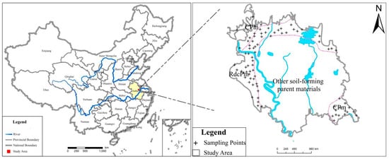 Anhui Province is a typical agricultural province in eastern China and is rich in mineral resources. The study area was located in the east of Anhui Province (Figure 1), and belonged to the agricultural area of the Jianghuai undulating plain. The sampling density was 4–16 points per square kilometer, and the basic sampling density was 9 points per square kilometer. The total sampling area was 18.76 km2, and 80 surface soil samples were collected in two soil parent material types (RdcPm and CPm).