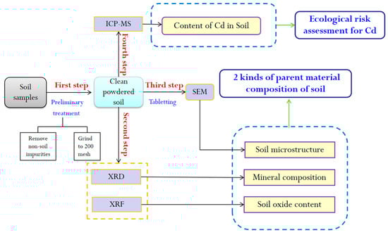 The experimental concentrations of this study mainly included the material composition test (XRD and XRF) of soil, soil sample microstructure and cadmium concentration. The purpose of each experiment and the logical relationships between them are shown in Figure 2.