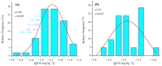 In this study, the total number of soil samples of red clastic rock soil parent material (RdcPm) was 56. The Cd concentrations of the above samples were statistically processed and explained by using normality tests []. Results showed that the distribution of Cd was lognormal to the left with a standard deviation of 0.0265 (Figure 3a). The arithmetic mean value (Cdamv) of 56 samples was 0.1158 mg/kg and the standard deviation was 0.0264.