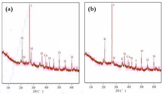 Composition types of minerals in two soil parent materials. (a) RdcPm; (b), CPm. Q: quartz; M: montmorillonite; I: illite; K: kaolinite; Ca: calcite; D: dolomite.