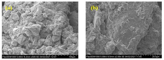 The microstructure of soil influences and controls its engineering geological characteristics []. In view of the differences in mineral composition between the above two types of soil samples, it is necessary to further discuss and perform comparative analyses. In this study, scanning electron microscopy (SEM) was used to describe and analyze the microstructure of the samples [], as shown in Figure 5. Soil samples were mainly composed of small particles and pores, with large pores distributed locally, showing the microstructure of small particles surrounded by large particles. However, the microstructure of RdcPm samples and CPm samples was obviously different. The RdcPm sample soil particles had rough surfaces and sharp edges and corners. However, the particle surfaces of CPm samples were relatively smooth. In addition, in terms of particle compactness, the particle distribution of the CPm sample was obviously looser than that of the RdcPm sample, and the contact mode between particles of CPm sample was mostly surface-to-surface bonding, whereas other contact modes were less close.