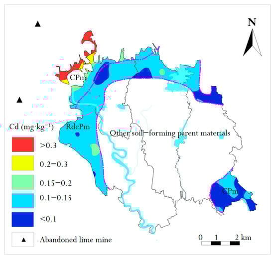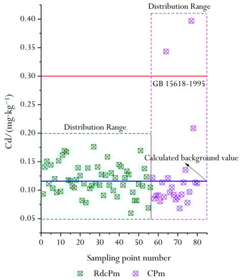 The Cd concentration is plotted as a scatter plot in Figure 6. It can be seen from Figure 6 that the Cd concentration of nearly half of the soil samples in the study area was higher than the background value of the study area, which indicates the influence of human activities on natural Cd accumulation []. Compared with the Chinese soil secondary standard (GB 15618-1995), the Cd concentration in RdcPm was lower (0.3 mg/kg). However, Cd in CPm was too high locally. This may be due to the concentration of iron and halogen in CPm. This enrichment is not only related to the lithology of carbonate rocks, but also to the strong mineralization of carbonate rock distribution areas [].