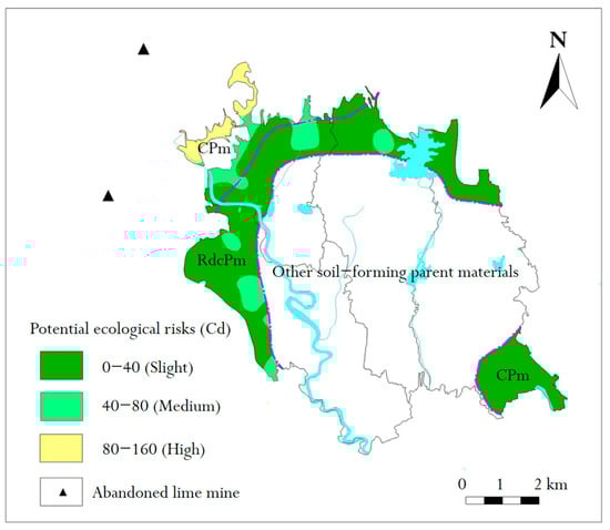 It can be seen from Figure 8 that Cd in RdcPm soil posed a slight risk and middle risk, accounting for 84.65% and 15.35%, respectively. In CPm soil, Cd was mainly a slight risk, accounting for 84.97%; the slight and medium risks of Cd were 7.05% and 7.98%, respectively. The data show that Cd mainly posed a slight potential ecological risk in the study area, and there were a few middle-risk and high-risk areas, whereas high-risk areas only existed in CPm soil (northwest of the study area). On the basis of the above statistical analysis, although the high-risk area was small, there were more medium-risk areas and river systems in the study area. Therefore, it is necessary to study the cause of formation, pollution source and prevention, and control measures of potential ecological risks of Cd in the study area []. As soon as possible, abandoned mine ecological rehabilitation should be performed, to control the potential sources of pollution []. Strengthening the study of chemical forms of Cd in soil [], understanding the characteristics of soil geochemistry, and performing the targeted remediation of soil pollution should be the goals of future research.