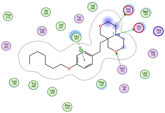 Two-dimensional molecular model of interactions between ST-2191 and amino acid residues of the binding pocket of the S1P1 receptor. Molecular modelling experiments were performed as explained in the Materials and Methods section. Green colored circles represent hydrophobic amino acids, while pink circles represent polar amino acids. Red contour is drawn around the acidic and blue around basic amino acids. The blue clouds in the structure of ST-2191 indicate the surface exposed to the solvent, while the blue halo around some amino acids indicates an interaction with the ligand, where a larger halo means a stronger interaction. Hydrogen bonds are represented by green arrows.