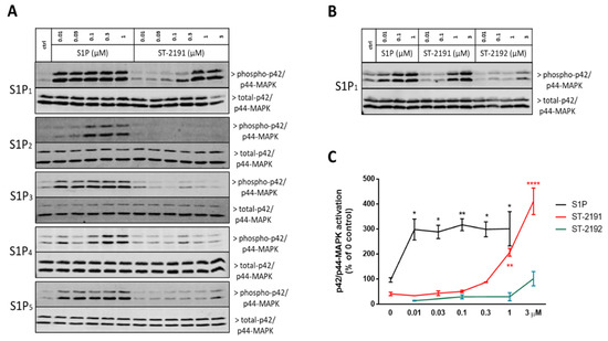 S1P receptor activation profile of ST-2191. CHO cells overexpressing the S1P1, S1P2, S1P3, S1P4 or S1P5 were stimulated for 10 min with vehicle (DMSO, ctrl), S1P (A,B), ST-2191 (A,B) or ST-2192 (B) in serum-free medium and were further processed for Western blot detection of phospho-p42/p44-MAPK and total p42/p44, as explained in the Materials and Methods section. Blots show one representative out of three independent experiments. (C) Bands of phospho-p42/p44-MAPK were quantified by using ImageJ software. Results are presented as means ± S.E.M. (n = 3). * p < 0.05, ** p < 0.01, **** p < 0.0001 compared to DMSO-treated control. A non-linear regression analysis was used to calculate the half-maximal effective concentration (EC50) of ST-2191 for the S1P1 (R2 = 0.96) as 1.99 μM.