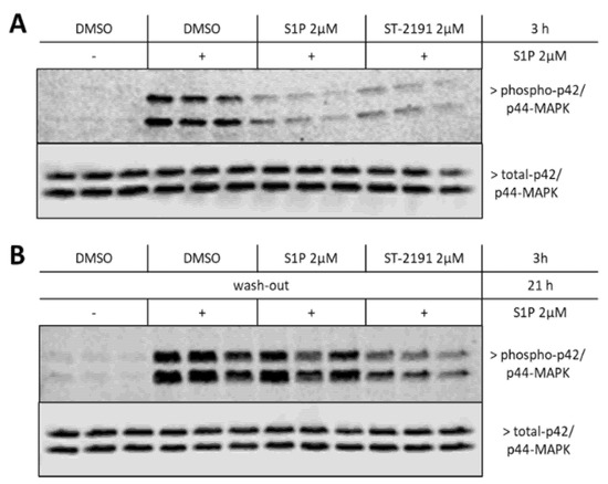 Prolonged effect of ST-2191 on S1P1 signaling. Confluent and starved CHO-S1P1 cells were stimulated with vehicle (DMSO, ₋), S1P or ST-2191 in a serum-free medium for 3 h (A) or 3 h with a wash-out period of 21 h (B) and were further stimulated with a new pulse of S1P for 10 min. Cells were lysed and processed for Western blot detection of phospho- and total-p42/p44-MAPK, as explained in the Materials and Methods section.
