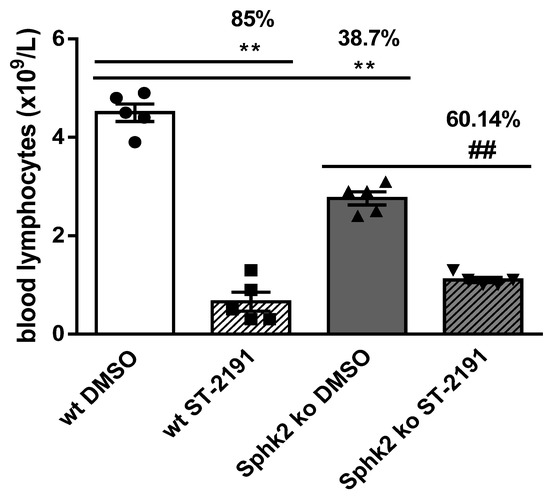 Several S1PR modulators, such as fingolimod, amiselimod and mocravimod, are prodrugs that exert their immunomodulatory role only after Sphk2-catalyzed phosphorylation [12,24,25]. Therefore, we tested the effect of ST-2191 on lymphocyte number in mice with global Sphk2 knockout and found that the lymphopenic effect was still present, although reduced, in the absence of Sphk2 (Figure 6). This suggests that ST-2191 does not depend on Sphk2 for its immunomodulatory activity, but it does not rule out whether other active metabolites can be formed in vivo. Notably, the dual S1P1+5 modulator ozanimod, which is currently in clinical trials for multiple sclerosis, inflammatory bowel disease and COVID-19, is metabolized to two active structures, which produce most of the clinical effects of the drug [26].