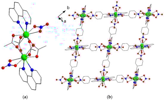 Binuclear block {Y2(phen)2(ONO2-κ2)2(μ-RCOO-κ1,κ1)2(μ-RCOO-κ1,κ2)2} in 1 (a). Coordination layer in 1 (b). Y atoms—green, O atoms—red, N atoms—blue. H atoms and quest molecules are not shown.