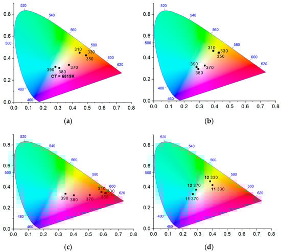 CIE 1931 chromaticity diagrams for trimetallic compositions 8 (a), 9 (b), 10 (c), 11 and 12 (d) at different excitation wavelengths.