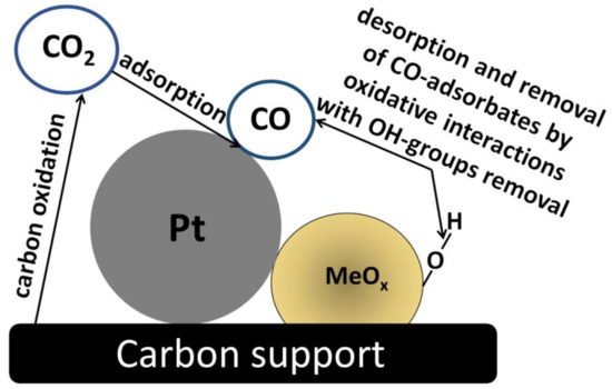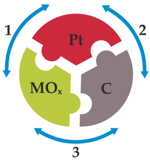The schematic diagram implying mutual interactions among the components of such multifunctional hybrid electrocatalysts is illustrated in Figure 1. The existence of strong interactions between MOx and noble metal (Pt) nanoparticles (1) should improve the stability and activity of the metal catalytic sites due to modification of the Pt electronic structure and diminishing of the oxo (OH) species adsorption on Pt surface, thus promoting centers for the adsorption of oxygen (reactant molecule) and the cleavage of O=O bonds [16]. The interactions mentioned above would also facilitate dispersion of Pt, inhibit their detachment and further aggregation, and, consequently, prevent or decrease their degradation during the fuel cell operation [17,18].