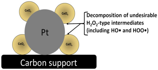 Activity of sub-stoichiometric CeOx nanostructures (with CeIII and CeIV ionic sites), which are existing on the catalytic platinum surfaces, toward decomposition of undesirable radicals and hydrogen peroxide intermediates [24,25,26,27].