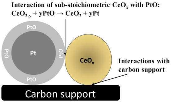 Importance of specific interactions of substoichiometric CeOx (having CeIII and CeIV ionic sites) with platinum oxo-species (diminishing formation of PtO or PtOH on catalytic Pt [29,32]) and carbon support (suppressing its corrosion).
