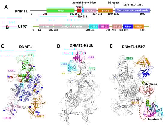 Structures of DNMT1 and its complexes with different partner proteins. (A) Color-coded domain architecture and numbering of human DNMT1 sequence. (B) Color-coded domain architecture and numbering of human USP7 sequence. (C) DNMT1 structure colored by subdomains, while disease mutations and PTM sites are denoted as magenta and blue spheres, respectively. (D) The constructed structures of DNMT1-H3Ub, DNMT1, Ub18, Ub23, and the H3 tail are colored grey, cyan, magenta, and yellow, respectively. (E) The constructed structure of DNMT1-USP7 and DNMT1 is colored grey and USP is colored by different modules.