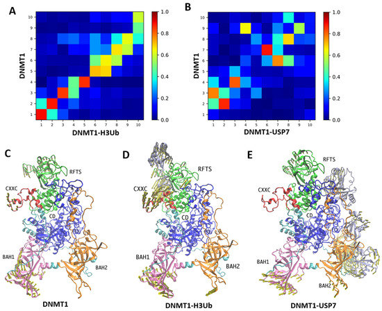 Intrinsic dynamics of three DNMT1 systems. (A) Overlaps between the ten slowest modes of DNMT1 monomer in isolated and H3Ub binding complex. (B) Overlaps between the ten slowest modes of DNMT1 monomer in isolated and USP7 binding complex states. The motions of the second ANM modes for the isolated (C) DNMT1, (D) DNMT1-H3Ub, and (E) DNMT1-USP7.