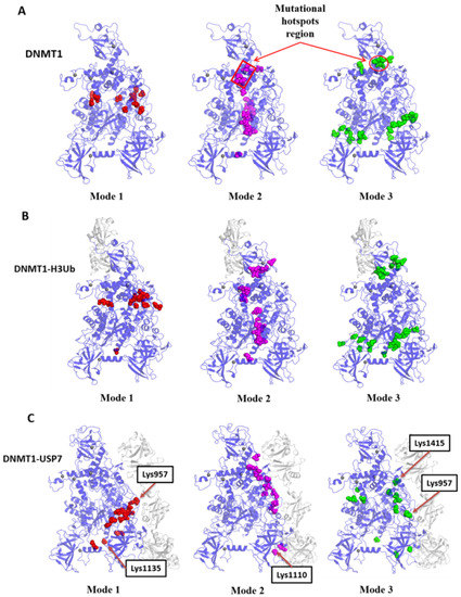 The prediction and structural mapping of hinge sites of (A) DNMT1, (B) DNMT1-H3Ub, and (C) DNMT1-USP7 based on their GNM modes 1, 2, and 3. The catching mutational and PTM sites are indicated by arrows.