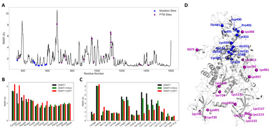 Residue fluctuations of three DNMT1 systems. (A) RMSF values per residue based on the MD simulation of Apo-DNMT1. RMSF values for each (B) disease mutation and (C) PTM in three DNMT1 systems. (D) Key mutations and PTMs are indicated on the DNMT1 structure.