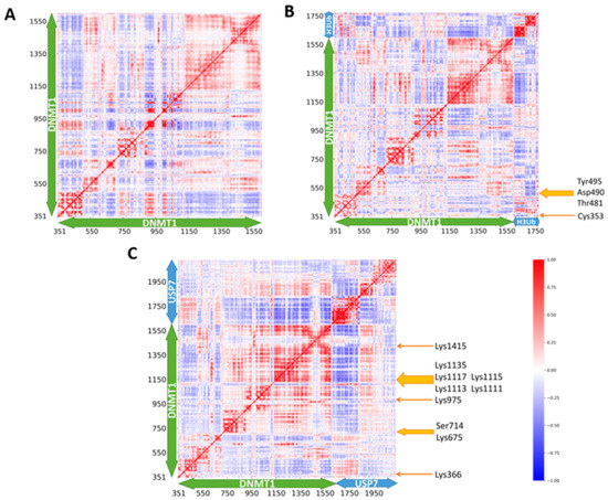The cross-correlation maps in MD simulations of (A) DNMT1, (B) DNMT1-H3Ub, and (C) DNMT1-USP7. Positive values indicate residues that displace in the same direction, whereas negative values are associated with the opposite displacement, as color gradient of red and blue, respectively.