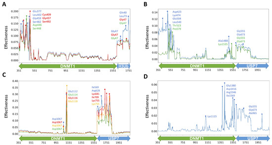PRS results for some disease mutations and PTMs in two DNMT1 complexes. Effectiveness profiles for (A) DNMT1-H3Ub by the perturbation of three disease mutational hotspots of Thr481 (the blue line), Asp490 (the green line), and Pro491 (the red line), for DNMT1-USP7 by the perturbation of (B) two disease mutational hotspots of Lys505 with the blue line, Tyr524 with the green line, (C) four interfacial acetylation sites (Lys1111 with the blue line, Lys1113 with the green line, Lys 1115 with the red line, Lys1117 with the orange line) and (D) Lys 1415 at distant site.
