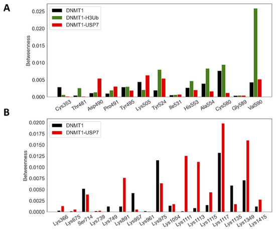Meanwhile, network analysis based on MD simulation, so-called dynamic network analysis, would give more dimensions of how residues involved in the signal transmit in terms of some network parameters. Our studies on other protein systems have proved that PRS effectiveness [36] and network betweenness centrality (BC) [37] are particularly useful to quantify molecular signatures of single sites and their abilities in signaling transmission. Therefore, herein, we also employed these two matrices to account for the allosteric dynamics of DNMT1 complexes. The systems analysis of the perturbation effects for mutational hotspots and PTMs was first performed by the calculation of PRS effectiveness. In DNMT1-H3Ub, only three mutational hotspot sites (Thr481, Asp490, and Pro491) were found to have similar strong perturbation effects (Figure 7A), which include local interactions with Glu377, Glu400, Leu402, Phe434, Gly459, Asn462, Phe479, Ser480, Ser482, and Phe483 within the RFTS domain, as well as long-range allosteric interactions with Gln40, Gly47, and Leu73 located at H3Ub. The signaling importance of these mutations was also predicted by the higher values of betweenness in DNMT1-H3Ub compared with the isolated monomer (Figure 8A). In addition, five other mutations including Tyr524, His553, Als554, Gly589, and Val590 also showed larger betweenness, which may be caused by hydrogen bond interactions between RFTS–CD domains to enhance their local interactions and inter-domain signal transmission. In DNMT1-USP7, two mutational hotspots (Lys505 and Tyr524) and four interfacial acetylation sites (Lys1111, Lys1113, Lys 1115, and Lys1117) were caught by higher values of effectiveness and betweenness centrality. The perturbations of Lys505 and Tyr524 show similar allosteric effects, and while they have long-range interactions with Gly555, Gly673 in USP7 may go through some local interactions with Asp423, Lys474, Glu504, Leu540, Thr523, and Pro579 within the RFTS domain (Figure 7B). Two additional mutations (Asp490 and Pro491) show much higher betweenness centrality (Figure 8A), increasing the signaling transformation between the RFTS and CD domains. The inter-molecular communication of four acetylation sites (especially Lys1111 and Lys1113 with the highest betweenness centrality changes, Figure 8B) was highlighted here to have long-range interactions with the UBL1–2 domain (Ile569, Arg628, Asp682, Ile709, and Lys755) of USP7 (Figure 7C). Expect for these interfacial PTMs, the perturbation of PTM Lys1415 at the distant site also shows inter-molecular and long-range allosteric communications with UBL1–2 (Gly555, Gly673, and Ala965) in USP7 (Figure 7D). The increasing betweenness centrality of PTM sites (Lys891 and Lys1349) may correspond to some stronger intra- and short interactions.