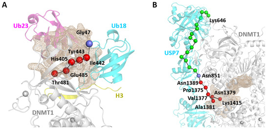 The implication of our study in drug design is finally discussed. The reported mutations of DNMT1 are tightly associated with various diseases such as HSAN1E and ADCA-DN, potentiating them as important therapeutic targets. To this aim, DNMT1 inhibitors are mainly developed for targeting its catalytic pocket, but suffer from poor selectivity, weak activity, and toxic side-effects [26]. Targeting allosteric sites at the protein–protein interface of DNMT1 complexes may present an alternative strategy to develop epigenetic drugs with enhanced pharmacological profiles and druggability. Therefore, the general understanding of allostery based on protein–protein interactions in DNMT1-H3Ub/USP7 could be promising in guiding the development of such allosteric inhibitors in the future. Three interfacial pockets, localized in close proximity to mutational hotspot sites and involved in long-range communication pathways across DNMT1-H3Ub and DNMT1-USP7 interfaces, may constitute valid targets to develop inhibitors able to modulate the function-related communication properties of these two DNMT1 protein complexes.