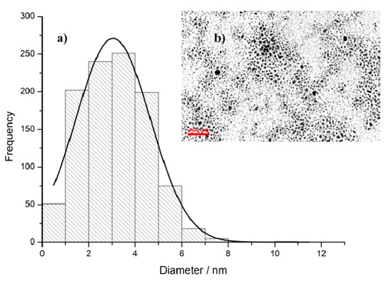 Generally, a high absolute zeta potential value suggests that nanoparticles tend to repulse each other, avoiding any aggregation process [40,41]. The investigated AgNPs showed good stability in an aqueous solution according to the Zeta Potential values in the range −40/−70 mV. Statistical analysis for particle size and distribution performed by TEM on different samples highlighted a high frequency of about 3 nm nanoparticles, as shown in Figure 1.