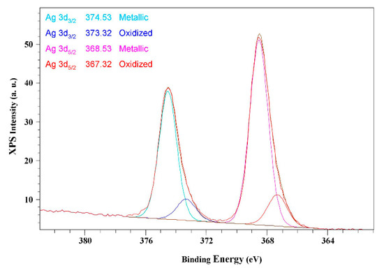 The chemical state of the silver was determined by the position of the peaks associated with the binding energy of the emitted photoelectrons in the XPS spectrum. In particular, the bulk value of silver corresponds to 368.1 eV, and the core level of the binding energy shifts directly provide the metal electronic properties [44]. One of the XPS spectra obtained for the AgNPs is reported in Figure 3 as an example.