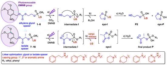 Self-immolation (SI) of 1–16; (a) SI is initiated by UV light (365 nm), which cleaves a photosensitive DMNB group [21]; (b) the intermediate I then spontaneously cyclizes, releasing R1 (4–6) or LG (7–16); (c) hydrolysis of the lactate-based cyclic intermediate leads to the final product P, whereas glycol-based cyc-I hydrolyzes to the final product P2 or the cyclic product cyc-P.