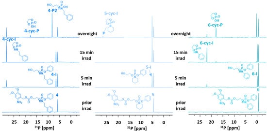 In contrast to 1–3, linkers 4 and 6 afforded cyclic intermediates 4-cyc-I and 6-cyc-I within 5 min of irradiation (Figure 2). In compound 5, bearing a secondary amine, only a trace of 5-cyc-I was detected overnight. However, the downfield shifted 31P-NMR signals of cyclic intermediates 4-cyc-I, 5-cyc-I, and 6-cyc-I (δP 28.0, 26.5, 21.7 ppm, respectively) indicated that the amine cargo was still attached to the phosphorus and that phenol was released instead.