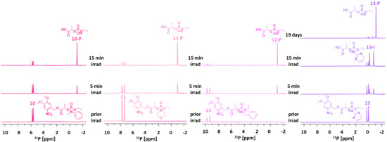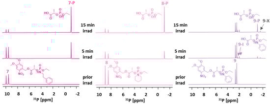 We monitored the SI of 7–9 in the HEPES/DMSO solvent mixture (Figure 3). In 5 min, we detected the final product P in all cases (δP −1.1 ppm). Linkers 7 and 8 did not provide any intermediate 7-I and 8-I, respectively, as they undergo fast cyclization, and photoactivation is a rate-limiting step. In turn, the SI of 9 was slow, and we did detect intermediate 9-I (Figure 3, right) or traces of the undesired product 9-X (δP −1.6 ppm). Considering the overall limited stability of 7 and 9, we investigated the formation of the unknown side product X and performed stability tests in 7–9. The results showed the limited stability of 7 and 9, which were significantly decomposed within 7 days (Figures S6 and S7 in the Supplementary Materials, details therein).