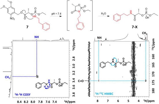 To identify the alternative decomposition pathway, we characterized the undesired product X. The significant upfield shift (δP < 0) suggested that the P-NH bond had been cleaved. In addition, one singlet 31P-NMR signal indicated the lack of a stereogenic center on the phosphorus atom. 31P-NMR chemical shifts of 7-X and 9-X differed slightly (δP −1.66 and −1.58 ppm, respectively), as found in the starting compounds 7 and 9 (differing in LGs). Combined, these findings demonstrate that 7-X and 9-X also differ in the amine moiety, which may be explained by the intramolecular rearrangement proposed in Figure 4. Additional 2D NMR experiments performed on linker 7 suggested the formation of carboxamide 7-X. We found the key interaction between the phenethylamine alkyl chain and lactate carbonyl in the HMBC spectrum (Figure 4). The proposed structure of 7-X was confirmed by HR-MS (Figure S64 in the Supplementary Materials).