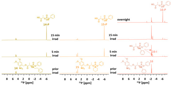 31P-NMR spectra of linkers 14–16, measured before and after irradiation with UV light (365 nm) using 5 mM solutions in a solvent mixture of 50% HEPES (pH = 7.4)/DMSO at room temperature (25 °C).