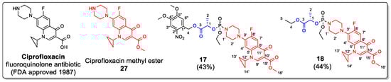 Ultimately, we prepared two model prodrugs of Ciprofloxacin (Figure 7), which is a known fluoroquinolone antibiotic containing a secondary amino group, to demonstrate the applicability of lactate phosphate-based linkers. To avoid side reactions during the synthesis of 17 and 18, we protected the carboxylic group of Ciprofloxacin by methylation, which should not decrease the antibiotic activity as reported previously [27]. Then, Ciprofloxacin methyl ester 27 was phosphorylated, following the procedure that had been used for model linkers 7–9 (Scheme 2). Two-step phosphorylation starting from DMNB ester 24 and ethyl dichlorophosphate 20 afforded photoactivable compound 17. In addition to 17, we also prepared its enzymatically activable analog 18. Both compounds were obtained in moderate isolated yields (43–44%) as ca. 1:1 mixtures of diastereoisomers, as confirmed by the presence of two sets of NMR signals.