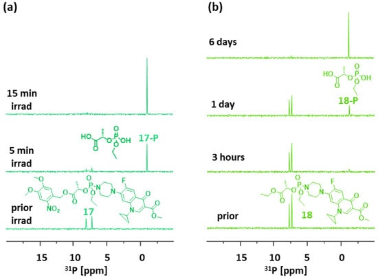 31P-NMR spectra of Ciprofloxacin prodrugs 17 (a) and 18 (b) recorded in 50% HEPES (pH = 7.4)/DMSO, 25 °C, with linker 17 bearing a photoactivable DMNB group, before and after irradiation by UV light (365 nm), and linker 18, where SI is activated enzymatically by lipase, before and after lipase addition.