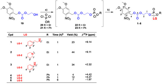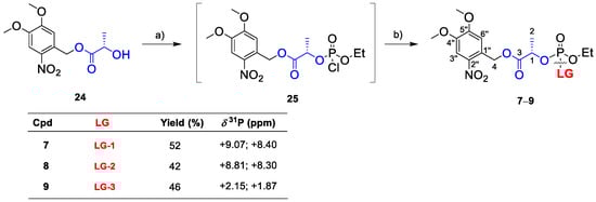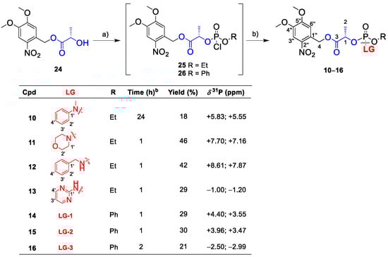 Lactate-based linkers 10–16 were synthesized under the following reaction conditions: (a) ethyl or phenyl dichlorophosphate 20–21 (0.5 mmol), TEA (0.65 mmol), dry toluene, 25 °C, 16 h; (b) the corresponding amine (0.5 mmol), TEA (0.5 mmol), dry toluene, 25 °C, 1–24 h.