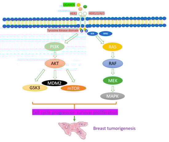 Pathophysiology of breast cancer. HER2 and other tyrosine kinase receptors present on the cell membrane and join to ligands. Tyrosine kinases undergo phosphorylation and start signaling pathways such as AKT and RAF.