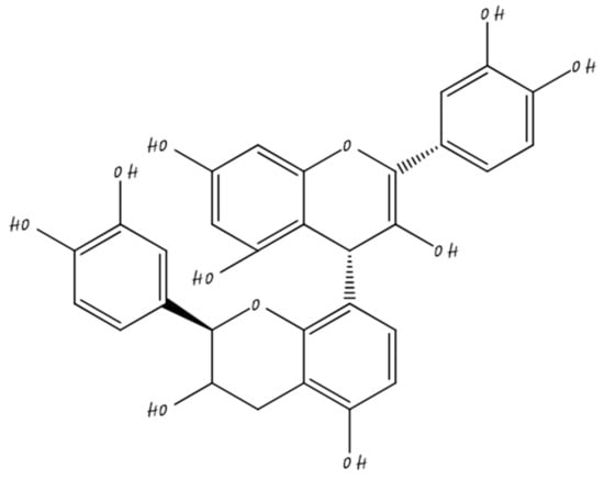 Procyanidin is a class of flavonoid belonging to proanthocyanidin or condensed tannins. Procyanidin exists in trimers, dimers, and tetramers and any oligomers of epicatechin and catechin shown in chemical structure (Figure 6). Dimeric procyanidins exist as procyanidin A1, B1, A2, B2, B5, B3, B6, B8, and B5; and trimericsC1, C2; procyanidins, and tetrameric procyanidin are cinnamtannin A2 and catannin A2. Procyanidin mostly present in cocoa, apple, berries, and grapes at elevated concentrations [69].
