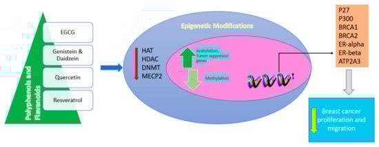Cancer is a multistage disorder which includes environmental, physical, genetic, chemical, and metabolic factors. A diet high in vegetables and fruits which are rich in antioxidants decreases the chances of many types of cancers, with antioxidants suggested to be efficacious [86]. Chances of developing breast cancer affected by non-adaptable factors which include genotype and age, and adaptable factors such as alcohol consumption, occupational exposure, smoking, and nutrition [87]. Obesity, inactive lifestyle, and harmful foods are the factors that increase mortality rate of breast cancer patients. Whether consumption of polyphenols from diet prevents breast cancer is debatable, as only high amounts of polyphenols are adaptable to hinder ERalpha+BC and ERalpha cells, while decrease in levels of polyphenols can restore ERalpha+ cells growth [88].