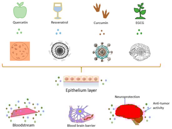 There are many types of polyphenols nanocarriers recently employed in the treatment of cancer. These include nanocapsules [21], solid lipid nanocarriers, nanoparticles [22], and metallic nanoparticles (gold) [23]. Selection of these techniques for nanoformulation leads to enhancement in biodistribution, pharmacokinetics, bioavailability, and specificity of drug transport to the site of cancer [24]. The applications of nanodelivery are discussed in Figure 1.