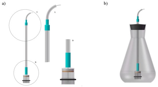 (a) Construction of the test probe, (b) probe in a mycelium in in vitro culture of A. bisporus flask (A—probe shaft, B—dipper).
