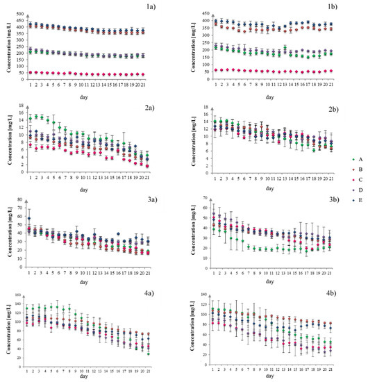Changes in Mg(1), Zn(2), Cu(3), and Fe(4) concentration in A. bisporus in vitro culture medium as a function of time; (a) indirect sampling and (b) direct sampling (A, B, C, D, E—symbol identify in vitro culture—according to Table 2).