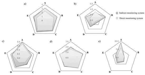 Radar graph showing (a) the distribution of biomass [g] growth in A. bisporus in vitro cultures, and the accumulation of (b) Mg, (c) Zn, (d) Cu, (e) Fe [mg/g] in biomass obtained from A. bisporus in vitro cultures depending on the system of monitoring the composition of the medium (A, B, C, D, E—symbol identify in vitro culture—according to Table 2).
