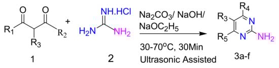 Bayramoğlu et al. accomplished the synthesis of 2-aminopyrimidines 3a–f (Scheme 1) by performing the corresponding reactions under both conventional and ultrasonic irradiation conditions. Conventional methods of pyrimidine synthesis have long reaction times and the crude product yields vary from 54–78% [34,35,36,37], while the ultrasound-assisted cyclization reactions facilitate the formation of target molecules in less than 1 h. Strong bases such as NaOC2H5 were used in several experiments giving final yields close to those of the conventional method. Numerous experimental parameters were explored in an effort to optimize the synthetic procedures. These involved selection of suitable base (Na2CO3, NaOH, and NaOC2H5) and molar ratio of the starting material to achieve the desired cyclization reaction. It was observed that Na2CO3 is adequately reactive to act directly for the cyclization reaction of 2-amino-4,6-dimethylpyrimidine and 2-amino-4-hydroxy-6-methylpyrimidine. A stronger base (NaOC2H5) is required for the synthesis of 2-amino-4,6-dihydroxypyrimidine and its derivatives containing different alkyl or alkylidene groups at the 5-position (Table 1). Additionally, the molar ratio of the respective substrate to base were determined, different ratios of base proportion versus 2-aminopyrimidine derivatives were evaluated and significantly better results were attained by using 1:1 equivalents. In the conventional synthesis of 2-aminopyrimidines, it is necessary to keep the temperature around 100 °C for about 5–8 h, whereas in the ultrasonic-assisted reactions temperature range of 60–70 °C is sufficient and the reaction time period is reduced to 30 min [38].