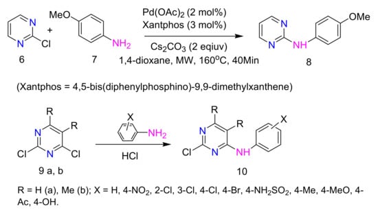 This method, which was modified by the use of modern reagents (bases and catalysts), is widely used in the synthesis of biologically active arylaminopyrimidines providing a diversity of structures for screening. Amination of 2-chloropyrimidine is usually carried out in presence of palladium catalyst under high pressure [40,41]. However, dichlorides 9a,b are aminated by aromatic amines mostly at position 4 rather than at position 2 (Scheme 3) [42,43,44,45].