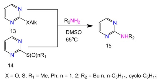 The replacement of a hydrogen atom at position 2 of the pyrimidine ring by the amino group occurs by the addition of the nucleophile, ring opening, and ring closure (ANRORC) mechanism, whereas the amination at position 4 occurs without the closure of the pyrimidine ring. The replacement of the chlorine atom in 2-chloro-4-phenylpyrimidine in the KNH2-NH3 system at −33 °C also occurs by the ANRORC mechanism [47]. 2-Alkylaminopyrimidines can be synthesized by aminolysis (with ammonia, butyl-, pentyl- and cyclohexylamines) of 2-alkoxy-, 2-alkylthio- 13, methyl(phenyl)sulfinyl-, or -sulfonylpyrimidines 14 (Scheme 5).
