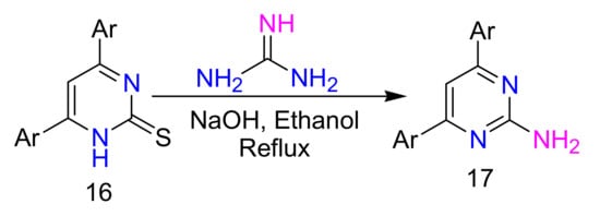 Sulfoxides and sulfones proved to be slightly more reactive and alkoxy and alkylthio derivatives are much more reactive in amination reactions compared to the corresponding chloropyrimidines. However, it is reasonable to use these compounds as starting reagents when the corresponding halogen derivatives are unavailable or unstable on storage [48]. 4,6-Diarylpyrimidine-2-thiones 16 react with guanidine to form 2-aminopyrimidines (Scheme 6).